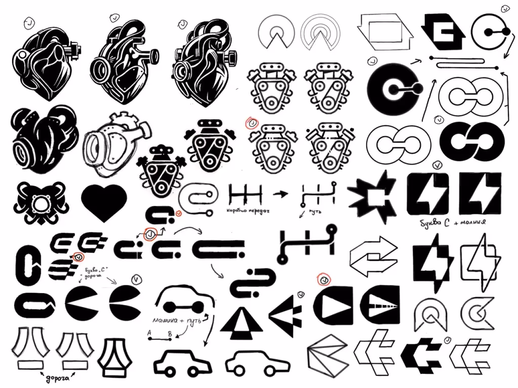 Роман: Начинаю я как правило с поиска подходящих образов (их я утверждаю у клиента). Затем я мониторю логотипы с выбранными образами (дрибл, пинтерест). Это позволяет избежать попадания в уже существующий логотип. Плюс это помогает натолкнуть на какую-то идею. Далее скетчи, отрисовка и еще одна проверка уже отрисованных мной знаков.