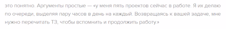 Почитал я вашу статью, остановился на этом - Аргументы простые — «у меня пять проектов сейчас в работе. Я их делаю по очереди, выделяя пару часов в день на каждый. Возвращаясь к вашей задаче, мне нужно перечитать ТЗ, чтобы вспомнить и продолжить работу.» - Это то что ни при каких условиях нельзя озвучивать заказчику насколько крупный либо мелкий заказ у вас не был. Это же азы!