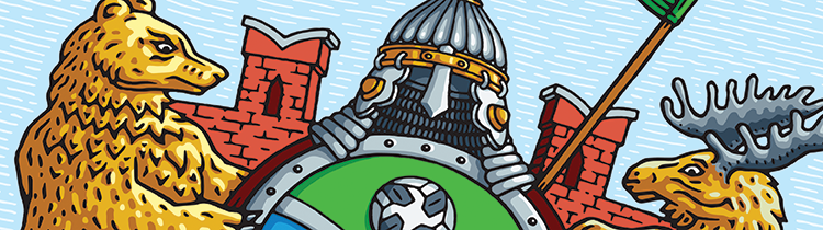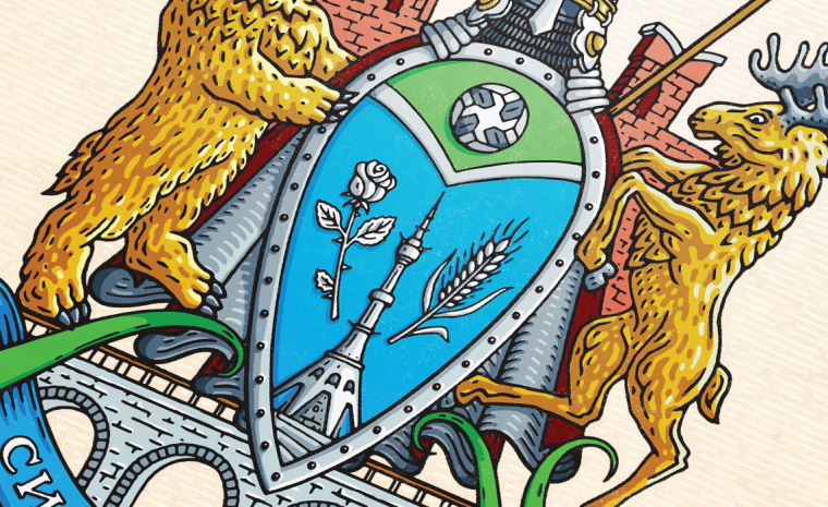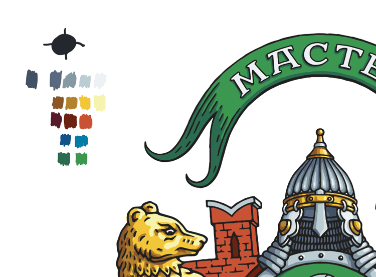 Думаю это можно показывать заказчику на первом этапе, немного волнуюсь, потому что с момента начала и до сих пор я с ним никаких контактов не имел и позволил себе максимальное творческое своеволие) Роман посмотрел и ему очень все понравилось. Похвалил и все такое. Сказал, что ожидал худшего) В общем сказал, что приступаю к раскраске и финализации работы. По цветам всё ясно. Акведук – белый. Кремль красный, Щит голубой с серебром и мяч на зеленой финифти. Щитодержатели золотые.