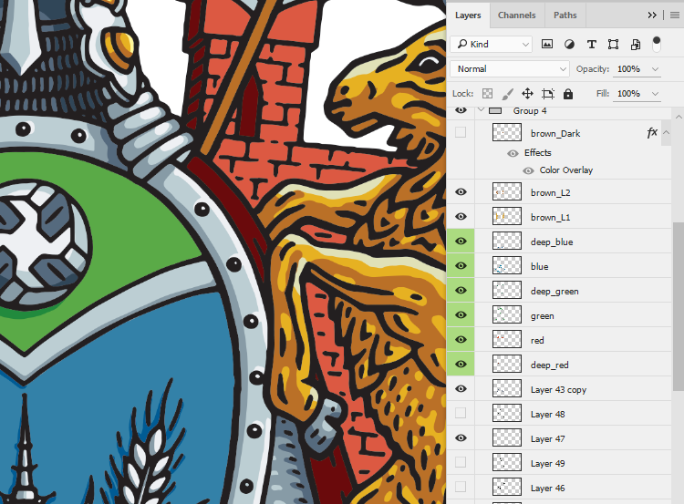 Каждый оттенок я отрисовываю на отдельном слое для того чтобы было удобнее переводить в вектор, так как при соприкосновении цвета смешиваются на границах растра, да и менять оттенки на ходу проще в эффектах слоя.