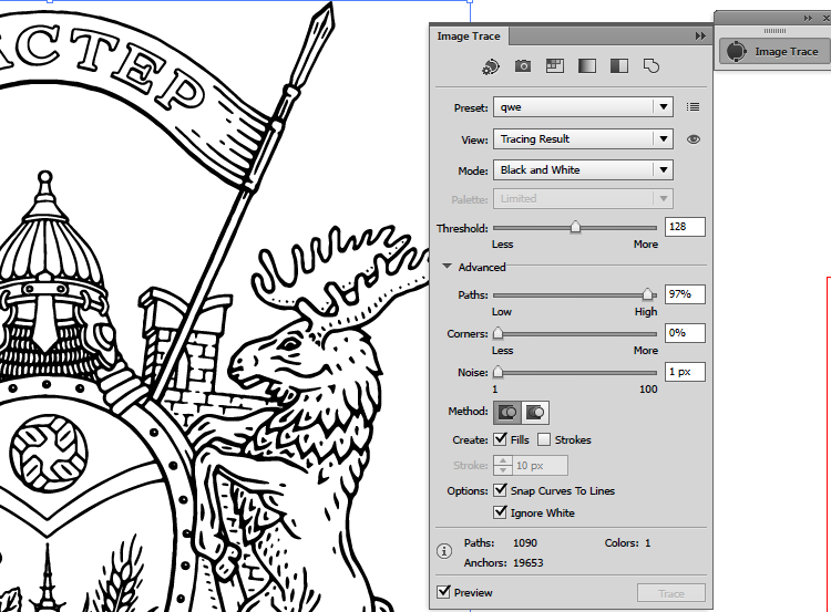 Далее я открываю иллюстратор копипаст выделенный слой из фотошопа покрашенный в черный и жму трассер с такими настройками: