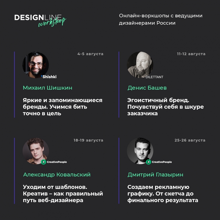 Design Line Workshop — это не привычный для всех формат лекций, а максимум практики с домашним заданием. На воркшопах по направлениям брендинг, веб-дизайн, CGI графика ты будешь оттачивать свои навыки под руководством куратора. Каждые выходные августа у тебя есть возможность почувствовать на себе, как работают настоящие профессионалы. За два дня ты сделаешь проект, курировать который будет дизайнер одного из ведущих агентств России. Ты получишь полезные рекомендации, индивидуальные задания, новые работы в портфолио и массу крутых знакомств.