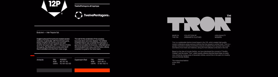 Контраст в любой форме — плавных и резких линий, толстых и тонких штрихов, а также крупных блоков с мелкими текстами — выглядит эффектнее благодаря контрасту. Вот примеры из верстки: работа Костадина Костадинова 12Pentagons и компоновка логотипа Tron с мелкими текстами.